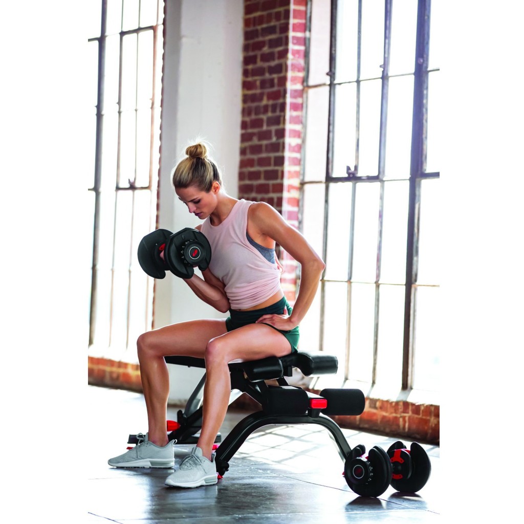 دمبل متغیر حرفه ای طرح بوفلکس مدل BowFlex SelectTech dumbbell BF552i یا دمبل بدنسازی بوفلکس معرفی شده در این بخش دارای پیچ تنظیم وزن با قابلیت تنظیم وزن هر دمبل از 2.5 الی ۴۰ کیلوگرم می باشد. شکل و فرم این دمبل متغیر بسیار شکیل بوده و دارای استند فلزی برای قرار دادن دمبل ها می باشد. این دمبل متغیر دارای دستگیره ضد عرق بوده و به صورتی طراحی شده که به کف دست هیچ آسیبی نمیرساند و از آسیب رساندن و جا انداختن بر روی دست جلوگیری میکند.
